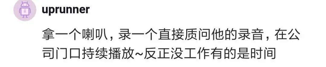 有人让楼主拿个喇叭录一段质问前领导的录音,在前公司门口持续播放,或者做个易拉宝放在公司大门口。