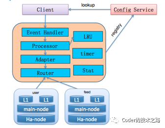 可以看到,在cache池上层,被封装了一层proxy逻辑,包括异步事件处理器用来管理数据连接、接收数据请求,processer用来进行数据解析,Adapter用来适配底层存储协议,Router用来路由请求到对应的资源分片,LRU_cache用来优化性能、缓解proxy性能损耗,Timer用来进行健康状态探测。