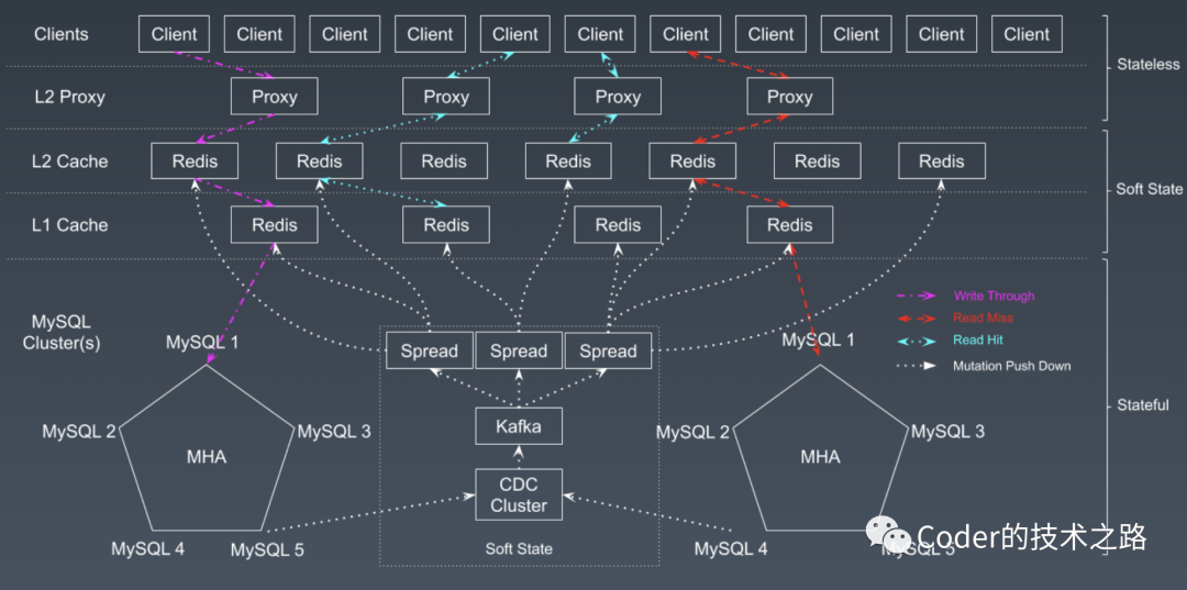 大家有没有发现这个架构思路很熟,是的,就是CPU的多级缓存架构。通过缓存拦截、副本扩展、压缩降压的方式,其实基本都是对前面章节叙述的缓存问题的整体应对,以达到低延迟且稳定的缓存服务效果。