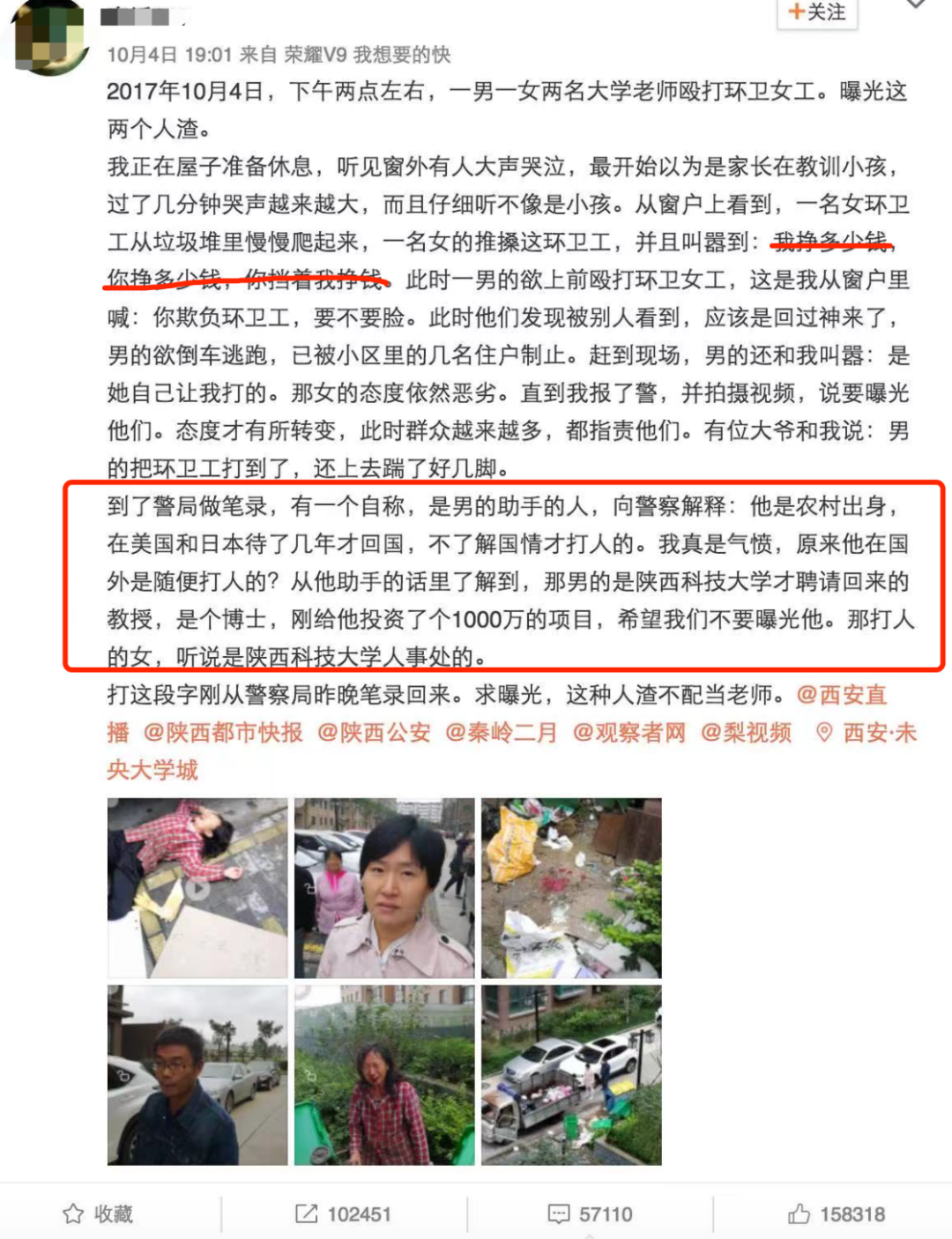 玉林玉州民主中路,人来人往,一个环卫工阿姨,正在埋头清扫地面。没有注意到后面来人,她不小心扫到了一个过路男子的脚。一个宣泄了情绪,一个真诚致歉,本以为事情就过去了。路边停下车,继续对着阿姨破口辱骂,最后直接抓起她的头发,对着头一顿暴打。炎炎夏日,酷暑难耐。拿着最低的工资,干着最脏最累的活。我实在不明白,不小心被扫到脚,究竟是怎样天大的事?的确,真正厉害的人,不会通过拳头,不会用践踏弱者而彰显自己的强大。一旦抓到机会,便在自己有限的权力范围内,疯狂输出自己的戾气。一个人的人品如何,看他对弱者,对比自己身份低的人的态度,便能清晰窥探他的为人。生活中永远不乏一类人,对强者奴颜婢膝,对弱者趾高气扬。在他们的潜意识里,自己永远高人一等。殊不知,自己的人品和素质,早就暴露无疑。最典型的例子,当属在小区因暴打清洁工“一战成名”的葛教授。一个同样出身农村的穷苦孩子,却在留过几年学后,忘了“国情”,丢了道德,也弃了人性。罗翔老师讲过一个观点,“对待弱者的态度,影响着你的人生路。”当一个人习惯自私妄大,欺负弱小,表面泄了私愤,其实是在葬送自己。最重要的是,这个名字,被永远钉在了“有学问,没素养”的耻辱柱上。开头暴打环卫工阿姨的那个男子,也被拘留10日,罚款500。有句话说得好,“欲成大树,莫与草争,将军有剑,不斩草蝇。”但我始终更相信的是,我们的宽容尊重,放过的是别人,但最后真正成全的,一定是自己。比起这些惹怒全网的存在,上个月,有个河南大哥获得了全网点赞。看着受损严重的车,货车司机愁容满面,无力蹲在了地上。奔驰车主下车后,看到此情此景,却只收了货车司机88块的红包。担心司机师傅心情不好影响开车,他还请专门请师傅吃了顿饭。一句话,让一场事故迅速化解,也让一个深陷自责的中年男人得以疏解。当这个河南大哥说出“图个吉利,发个88块红包”时。留给司机师傅的是尊严,留给自己的,是不过分纠缠,不斤斤计较后的轻松和做人格局。这个充斥戾气的社会,尊重弱者,善待弱者,终究是我们一生都要修习的课题。昨天看到一句很触动的话,“我讨厌这世界的大部分,但总有一部分留住我。”姑娘忍不住上前,一直夸爷爷的小狗可爱,还给小狗买了罐头。每月只有一千多工资的爷爷,却转头给姑娘买来了奶茶。两杯奶茶对爷爷来说,并不便宜,但这是第一次有人喜欢他的小狗呀。“不是因为喝到了免费的奶茶,而是感受到了人与人之间的善意”。下一秒,“突然就懂了那句,人活着不就为了那么几个瞬间吗”?广东韶关,天气很热,师傅冒着高温,修了几个小时的空调。女主人担心师傅中暑,留师傅在家吃饭,还多给了他200元。简单的一顿饭,融化的是一颗常年出门在外,早已冰冷坚硬的心。人心越来越冷漠,但总有人不遗余力改变着社会的风气。浙江温州,40度的天气,工人还在24层高的外墙干活。屋里的女业主实在不忍,坚持两次,把饮料送到了师傅手里。在社会底层挣扎的人,你不知道,你的一点包容,一点理解,会给他们多大的力量。在比自己弱小之人面前,只会生出打从心底的尊重,宽容与心疼。多给那些还在烈日下奔波的环卫工、外卖小哥、农民工一些善意吧,别让自己被戾气给吞噬。ps:因为公众号改版,很多朋友反映,看不到脆皮的文章了。这样,以后你们就能继续看到我的文章。我以后,也能继续从你们身上收获温暖、力量、互动的快乐、前行的动力。大家好,我是脆皮, 一枚新晋奶爸,创业公司高管。去过很多城市,也曾在路边练摊。现在只想和你说最真的话,持续成长,不断精进。