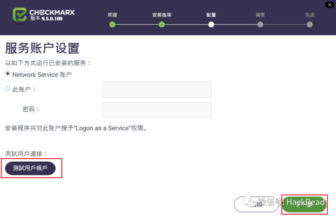 服务账户设置选择 Network Service账户,然后点击测试用户账户,测试成功后直接点击下一步