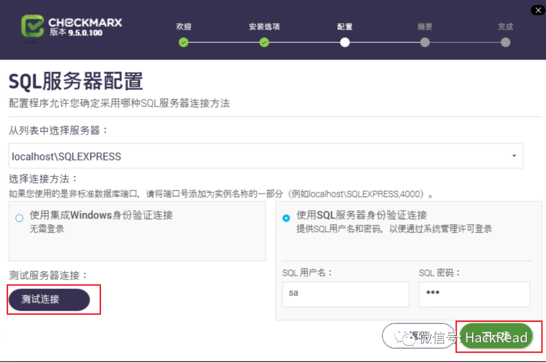 填写数据库连接信息,在上文的 MSSQL 安装环节,开启了 MSSQL 的 sa 账户,所以此处直接使用 sa 账户进行测试连接,测试成功后直接点击下一步
