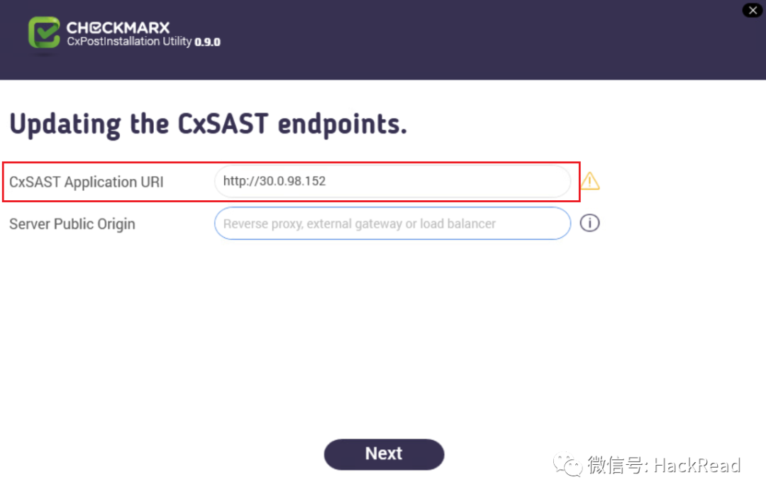 程序执行后修改 CxSAST Application URI 为实际需要访问的域名 / IP,如使用域名访问,请确保域名已经完成 A 记录指向,然后点击 Next