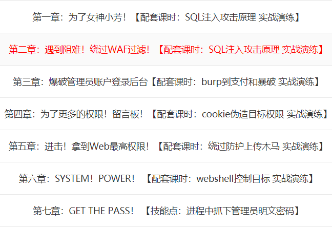 在成长的道路上怎么能缺少打怪刷级的乐趣呢!市面上的网站漏洞组成复杂,而且会有法律风险(任何非经授权的渗透都是违法行为哦~)所以为了更好的帮助大家对课程中技能的理解,我们给大家准备了一个练手的平台——封神台。课程是和靶场相对应的,听完课去做靶场,熟悉相关技能的原理,熟悉相关技能的操作。靶场新老手都适用!![]()