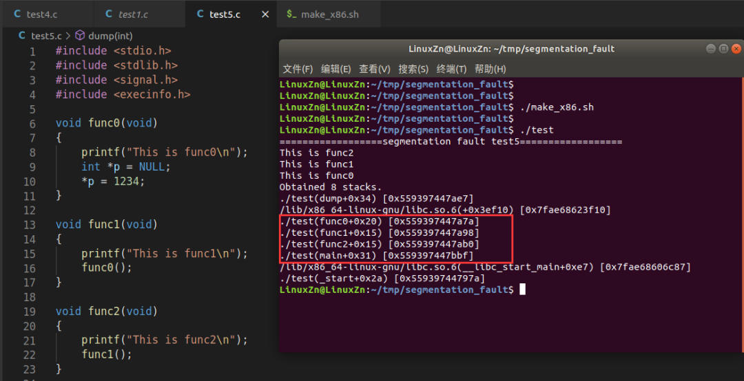 当程序发生段错误时,内核会向程序发送SIGSEGV信号。dump为SIGSEGV信号处理函数,其实现用到了execinfo.h里的两个函数:
