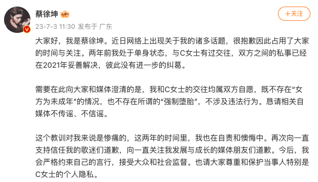 @蔡徐坤工作室 发文称,艺人工作室注意到近日网上有关艺人“与未成年人交往”、“强制堕胎”等诸多不实言论,并有恶意营销号蓄意捏造、传播虚假信息制造事端,给公众和部分媒体造成误导,工作室在此代表艺人郑重声明予以澄清。工作室称,“该等谣言严重损害了艺人人格权益与社会公众形象,并涉嫌侮辱诽谤,现已经完成侵权证据保全,第一批针对侵权行为的诉讼已经提交法院立案,后续会根据法院庭审进度及时披露”。