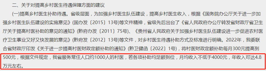 此前,贵州省卫健委针对人大建议作出明确回复,贵州省服务常住人口约1000人的乡村医生,若各项补助均足额到位,月均收入不低于4000元,年收入可达4.8万元左右。
