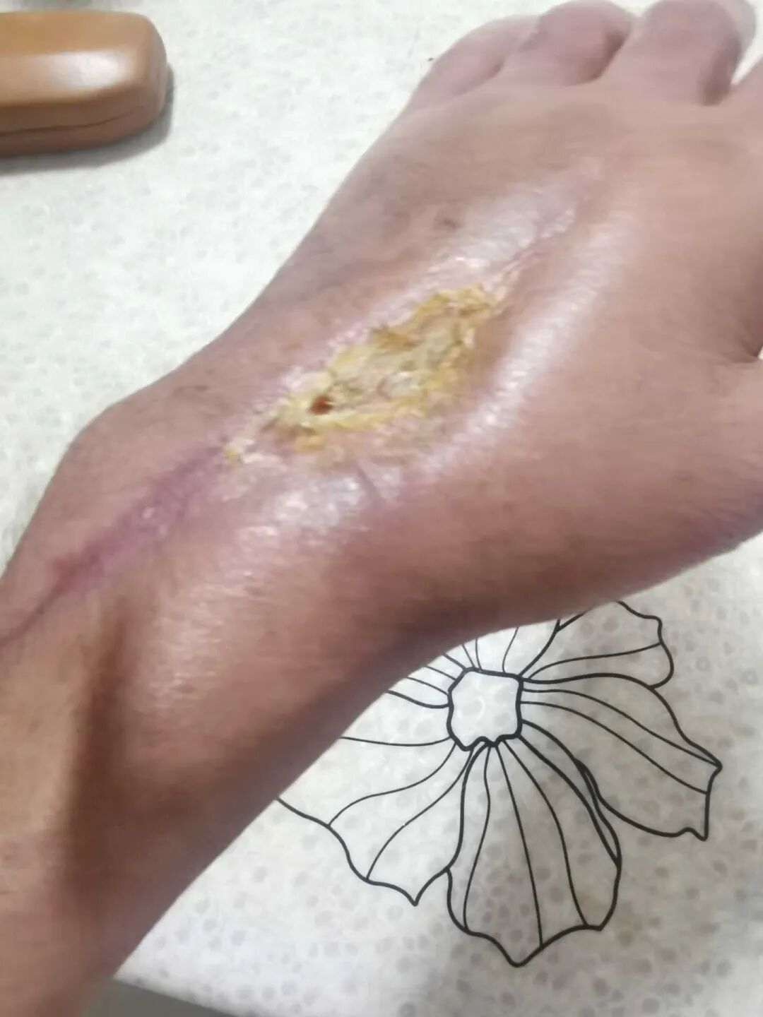 第二天,医院就给叶阿公安排了首次手术,分别清除了左手掌和左手背的坏死组织,并进行抗菌消炎。经过近一周的治疗,叶阿公手臂的感染终于得到控制,肿胀慢慢消退。
