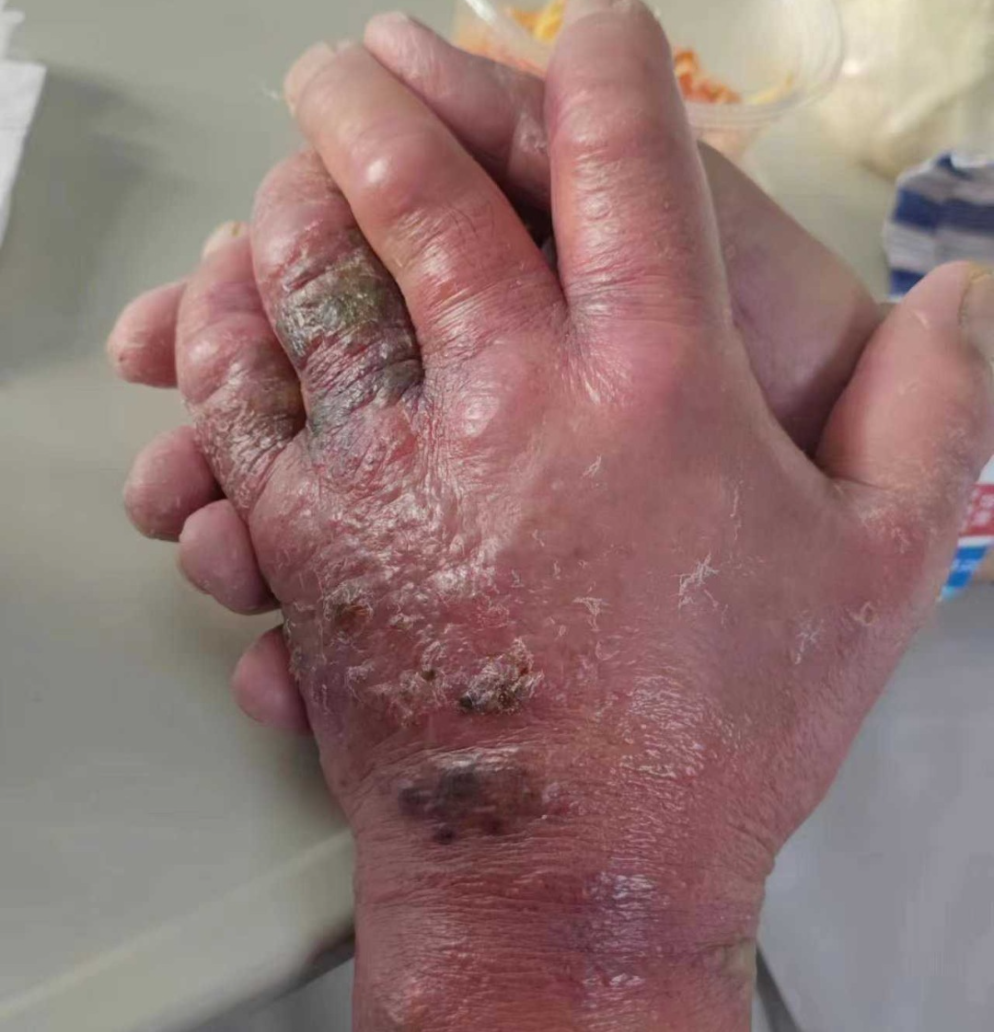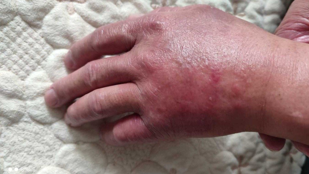 2月22日晚,71岁的叶阿公发现左手小指头背上有点红肿压痛,继而出现脱皮。叶阿公说,自从2018年3月确诊肺癌以来,这种情况也出现过多次,主要原因为更换肺癌靶向药时导致的副作用,一般过几天就会自愈,所以他就没怎么在意,去医院开了点外用药涂涂,想着过两天就好了。