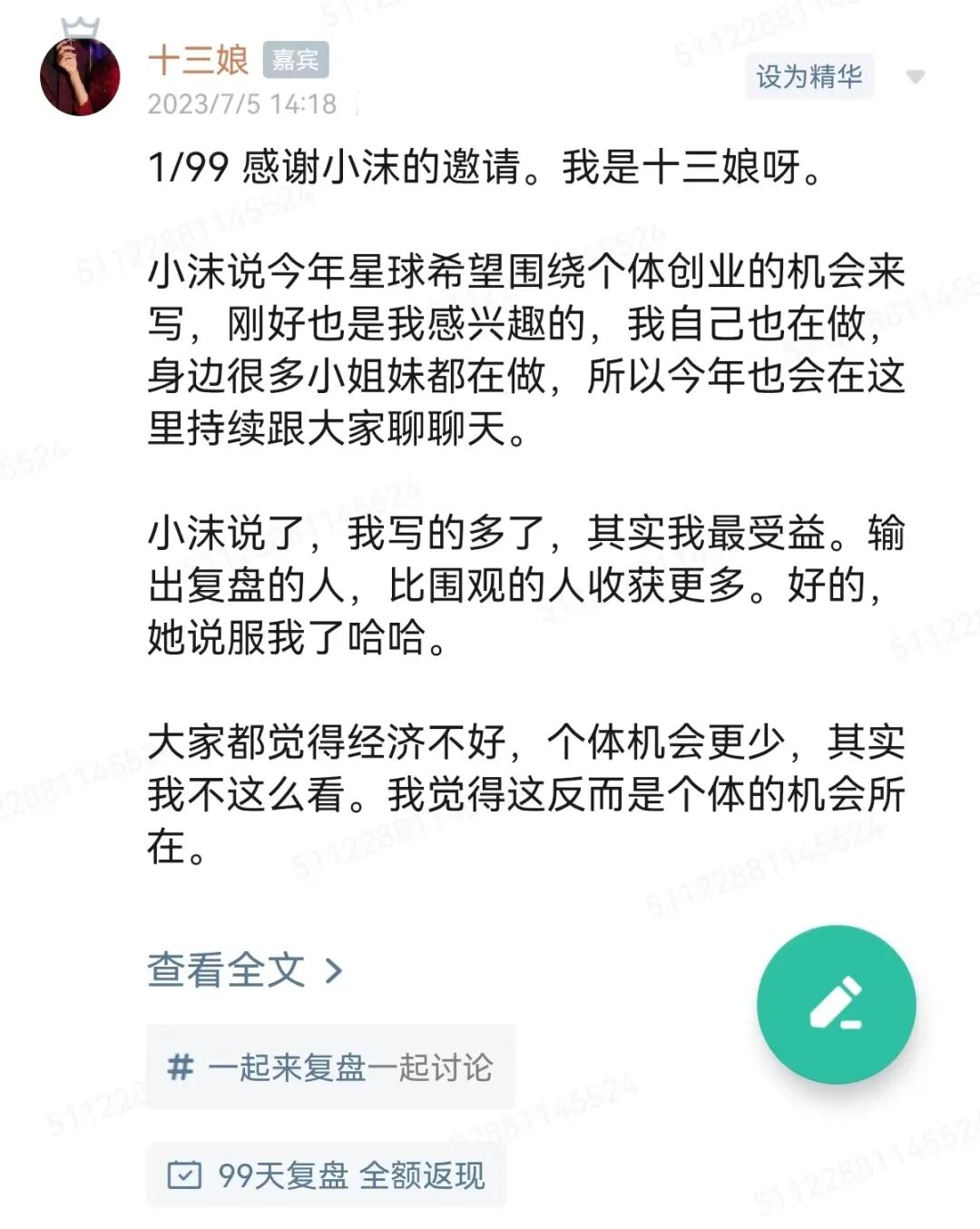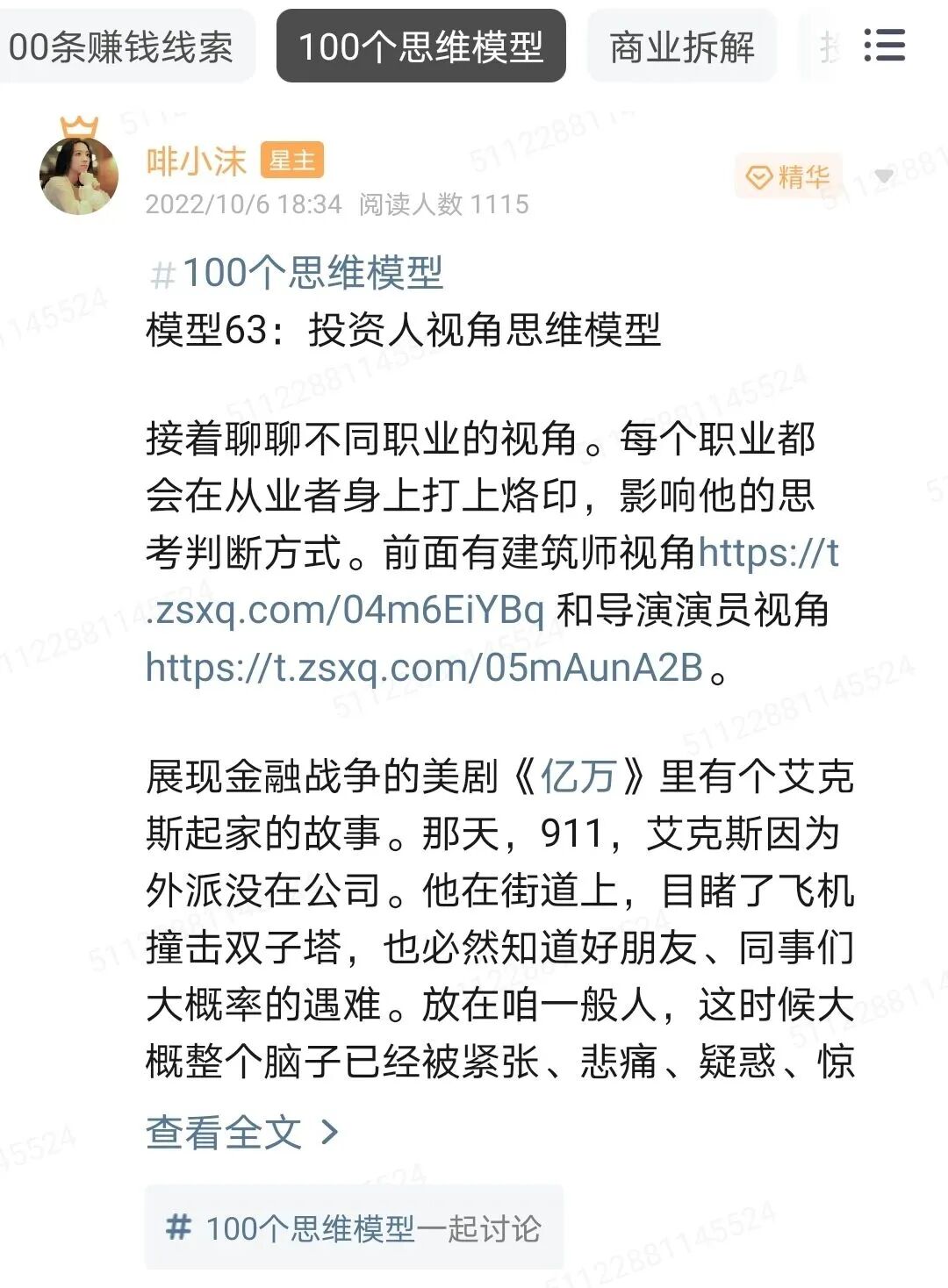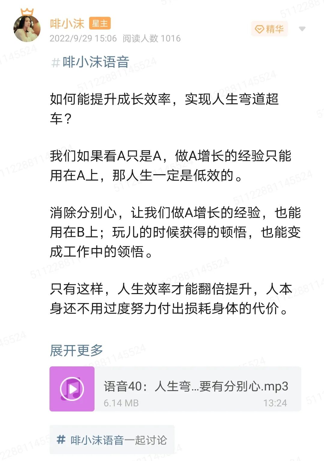 当得知没有,大家都表示希望搞,希望有个相互交流的平台。另外也希望能有体系地输出内容,能让大家反复看,有反馈,真正做到一起进步。但是我之所以一直很慎重,没有拉群,是因为考虑到直接拉个群,一方面并不能有系统地去搭建知识,让大家真正有收获,另一方面维护起来也不容易,很容易就沦为广告群或者闲聊群。我们人都是很容易被环境带跑的,所以创造一个严肃认真的学习探讨氛围是非常重要的。直到我去年仔细研究了分享知识的APP——知识星球。可以给分享内容打标签做系统梳理,可以有问答流程方便群友随时向小沫提问,可以分享语音等各种文件,方便保存。知识星球可以方便地创建不同板块,系统梳理知识。比如100条赚钱线索、100个思维模型等等。好内容可以在我的星球里不断沉淀,方便大家随时查看。无论你目前做什么工作,希望获得哪方面的成长,真的不要放弃输出这条捷径。认知写出来、讲出来,收获最大的一定是自己。很多读者跟我说,我知道输出重要呀,可是开始很难。那不如就在我的知识星球里,跟我一起来输出吧~先给自己一个小目标。星球有效期内累计输出99篇300字以上复盘内容或20篇加精,直接全额返还门票(现金)。我们不希望大家是为了复盘而复盘,为了坚持而坚持。所以复盘输出返现,不要求连续输出。