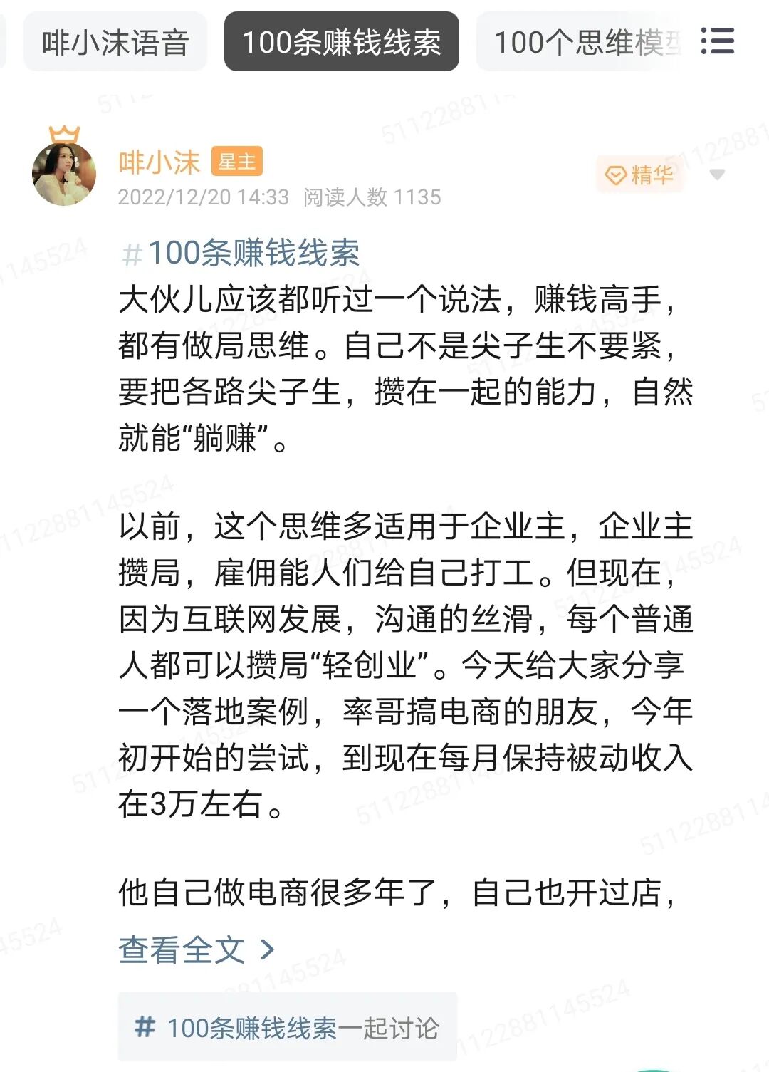 比如你想搞个副业,但是迟迟没有行动,完全可以用复盘倒逼行动、治愈拖延。对自己成果有了阶段性总结,回头会发现自己竟然走了那么远。这个部分,邀请了百万学长来复盘他的投资笔记,邀请了小店女老板十三娘,复盘小店带货、运营的心得,个体创业心得。很多读者朋友希望跟我一对一咨询,我也想更多帮到大家。但限于时间精力真的是有限,之前咨询的价格是899/小时(我几乎所有事情都亲历亲为,咨询全部是自己做没有助理,不像大机构可能打招牌的是一个名师,进去真正咨询的是入职几个月的助理)。每人每月可以向小沫免费提问3次。围观别人的问题,其实也是认识自己的一个好途径。星球刚开张不久,就有小伙伴在星球里询问自己目前的瓶颈和情绪问题,其实客观看,她各方面都做得超优秀。后来,她在看别人财富承受力的问题时,顿悟到自己遇到困难的原因,解开了心结,马上恢复了好状态。做任何一个重要选择,都要先想长期目标是什么,未来10年、20年想要的是什么,这个选择与你的目标是相符的还是相悖的。如果简单拉个读者群,内容也沉淀不下来,再慢慢有人发广告了,可能大家就把群屏蔽了,我也可能没了动力过几天就不做了。而在知识星球,可以沉淀下有价值的东西。让我们可以真正一起成长5年、10年、20年。啡小沫语音、100条赚钱线索、100个思维模型、啡小沫随心分享、商业拆解、投资理财、保险干货、问答、互通有无。这部分,我会深度剖析我自己的成长过程,不仅过去的,还有现在的。可以理解成小沫私房话板块。但是私房的同时,会给大家分享很多落地的解决办法。星球上线的时候,先录了挖掘天赋的17节音频:挖掘自己的底层优势变现。接着,录了知识变现、自媒体0基础入门的18节内容,毫无保留分享我两年用自媒体变现300万的经验。星球刚刚更新完人生弯道超车系列,分享我工作8年来,对职场、人生如何能弯道超车、取得超越同龄人发展的思考。这部分一年会输出几十万字,市面上这样的知识产品,打包成课起码卖5000块。除了市场上各种赚钱机会、赚钱底层逻辑的分享,我自己的实战经验,也会无保留分享。我从0开始小红书做到了3.4万粉丝,B站目前3.5万粉丝,最近尤其B站数据越来越好。你要是刚好有需要,想在这个方向发展,这部分我实操的经验,也起码让你少走价值几万的弯路。这两个平台我都是0基础开始做的,也没花一分钱,甚至到大部分剪辑都是我自己一个人,所以作为一个赚钱小副业,很具有参考性、可复制性。怎么赚更多钱?如何能从事既赚钱又喜欢的职业?如何与老板、同事相处?升职加薪为啥又没我?大部分人之所以一毕业会迷茫,是因为发现突然之间,生活里遇到的所有问题都无法用学校学到的知识解答。而倘若你硬要套用某个原理、公式,那一定会撞得头破血流。投资大师查理芒格曾说:“一个人如果掌握100个思维模型,你就可以比别人更聪明。”这部分不仅你可以每月免费向小沫提问3次,还可以向专注在投资理财的百万学长提问。目前已经积累了160+问答,进星球都可以查看。很多时候,我们跳出自己的问题,去看别人的问题,会像照镜子一样,对自己有更清楚的认识。每个板块都够打包一个价值几千块的知识服务,目前重磅干货板块就有8块。但是,不要几万块,不要几千块,一整年只要499。并且,星球啡小沫读者群 今天在搞活动哈,发200元大红包,券后只要299,马上截止了,过几天就恢复499原价了。1. 赠送我的一门课程《走个性化职场快车道》,价值199元;