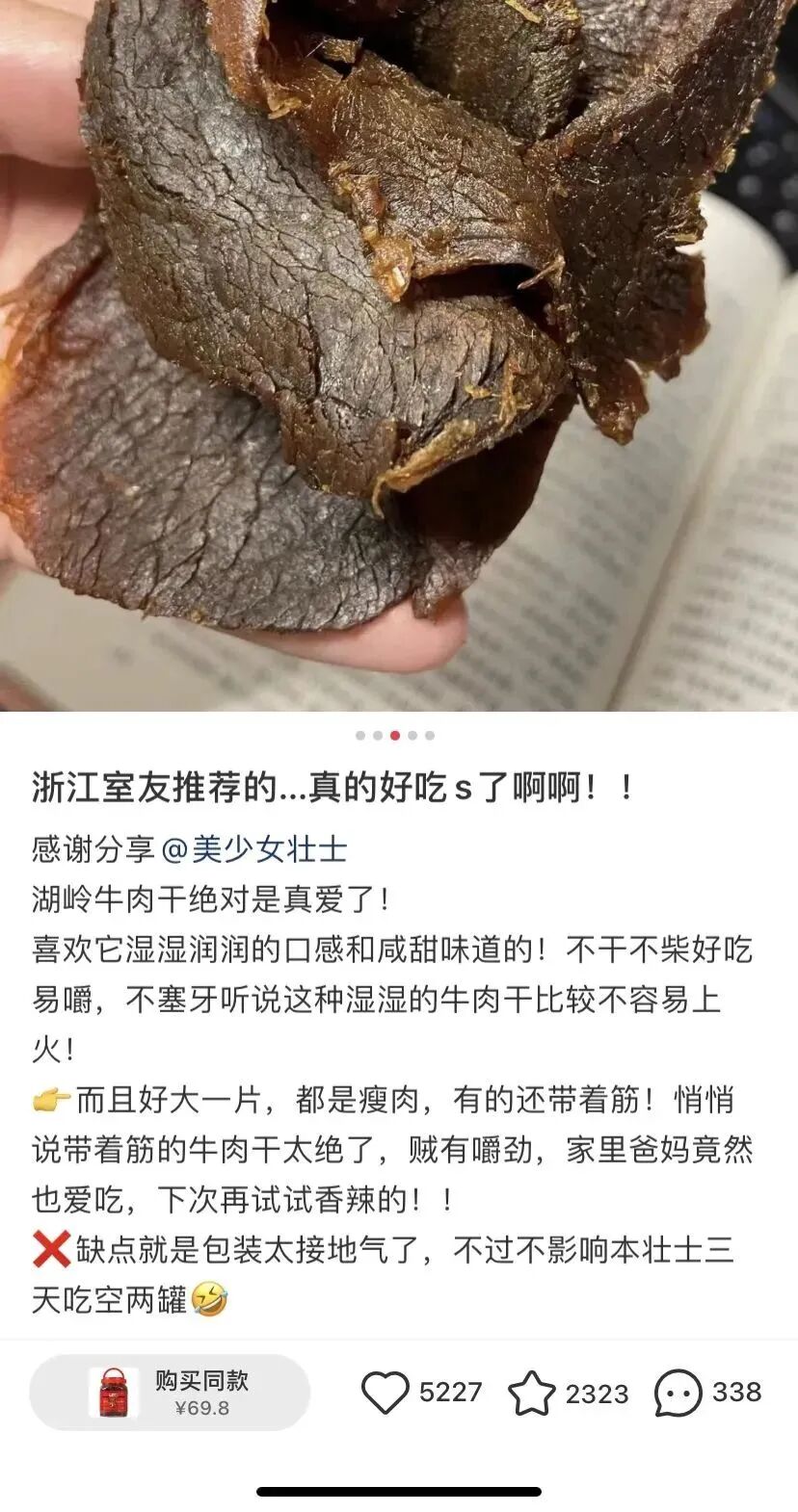 标题不是商家的那种很生硬的科普,都是站在用户或者推荐的角度写的,比如说【感谢温州室友给我的推荐】,【当地火的一塌糊涂的牛肉干】,这样的语气,在小红书很吃香的。