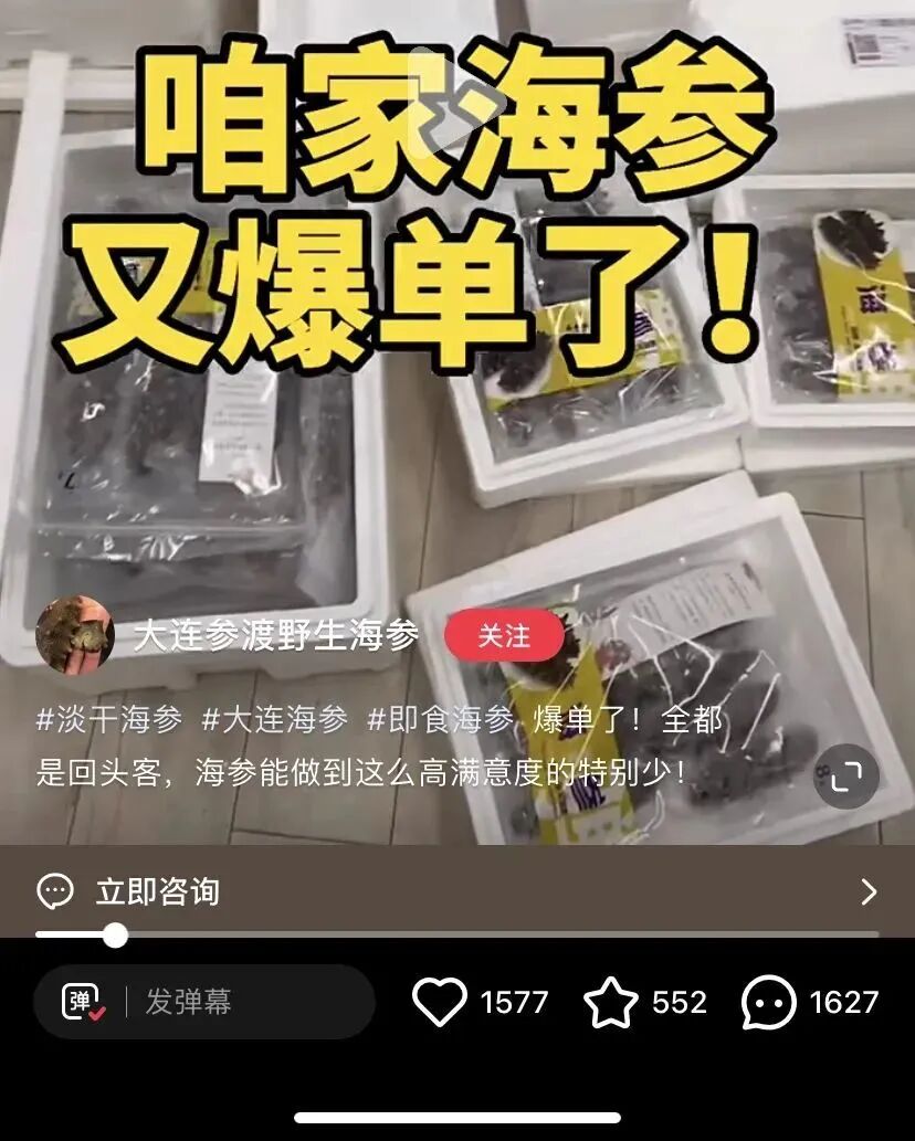 直接拍视频晒出来,如下图,标题起个【大连海参爆单了】、【山东海参,快递小哥三轮车装不下了】。