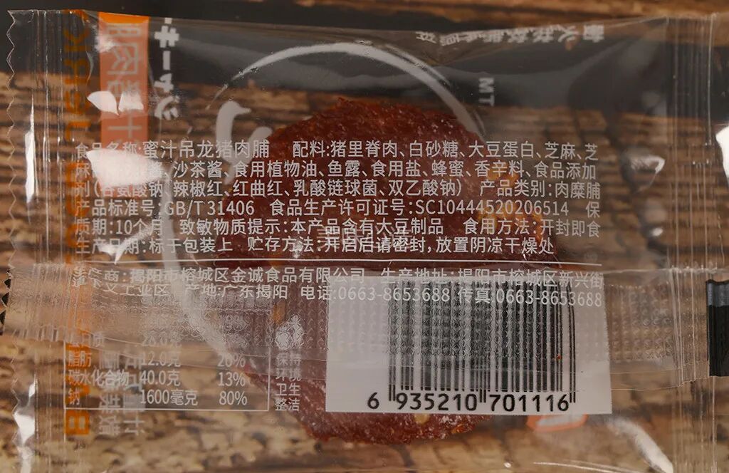 配料:猪里脊肉、白砂糖、大豆蛋白、芝麻、芝麻酱、花生酱、沙茶酱、食用植物油、鱼露、食用盐、蜂蜜、香辛料、食品添加剂(谷氨酸钠、辣椒红、红曲红、乳酸链球菌、双乙酸钠)