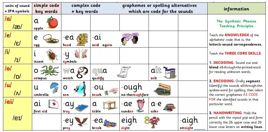 我们之前说过,在自然拼读的规则里,一个音可以由不同的字母或者词根来发出,那么什么样的词根会发什么样的音呢?有什么规律呢?那么这张表格能给孩子答案。