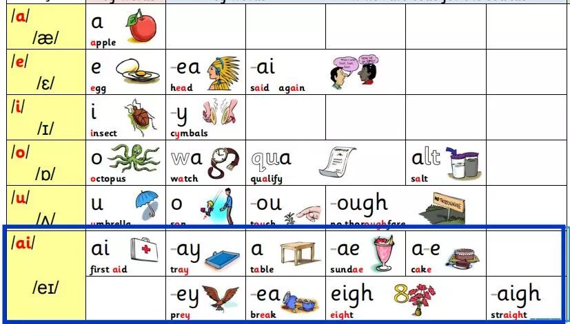 在每一行里,左边一列是Phonics里面的一个单音,比如 /ei/,这就是一个单音。