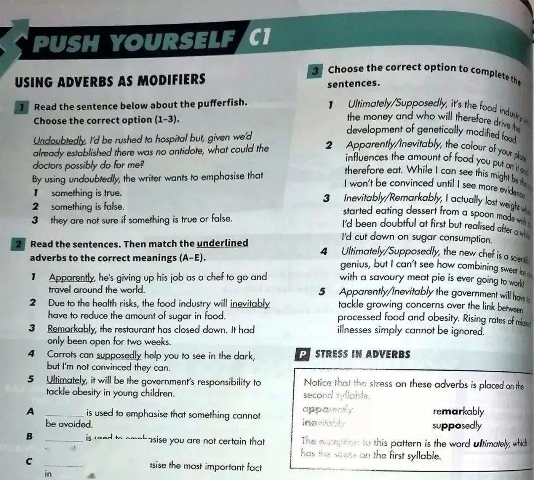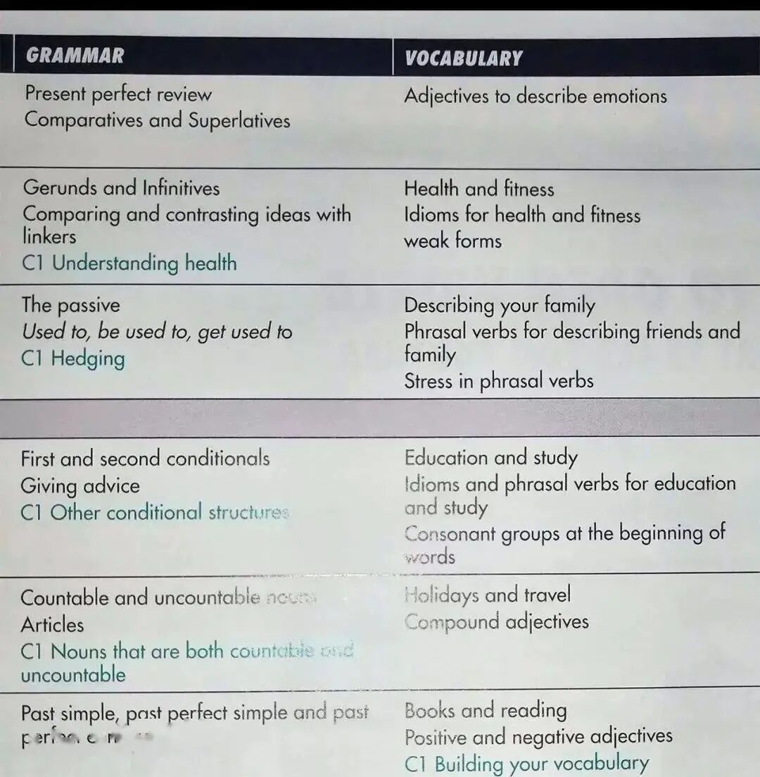 针对不同能力的学习者,教材会有不同目标的培养。例如在这本针对FCE考试的B2难度的书中,如果学习者有超过一般人的学习能力,他在每一个单元还提供C1-CAE难度的高标准训练(见“ 语法和词汇目录页截图”蓝字部分),为那些在相关级别考试想冲刺卓越和满分的孩子提供帮助。