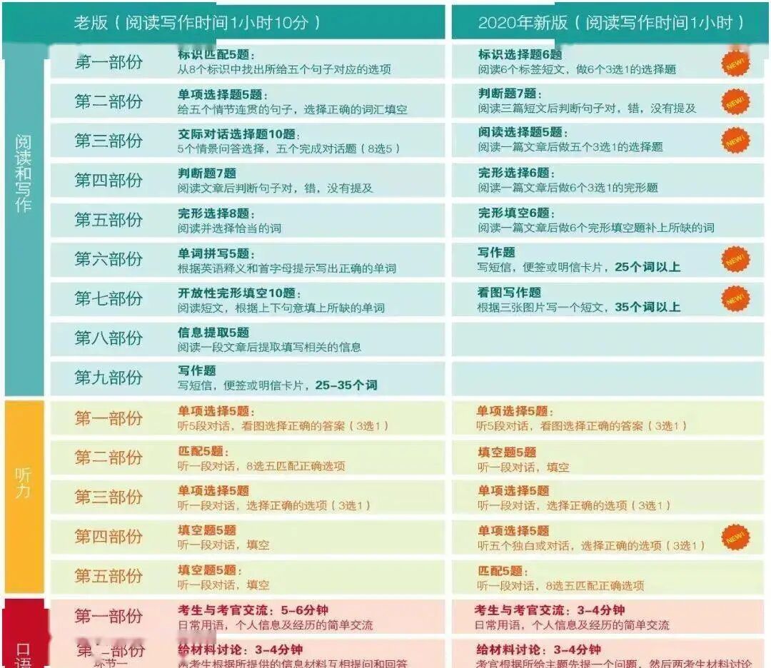下面这张表格展现了新旧版考试发生的变化。更加重视孩子对语言的运用能力。听说读写都有调整,特别是写作和口语增加难度要求