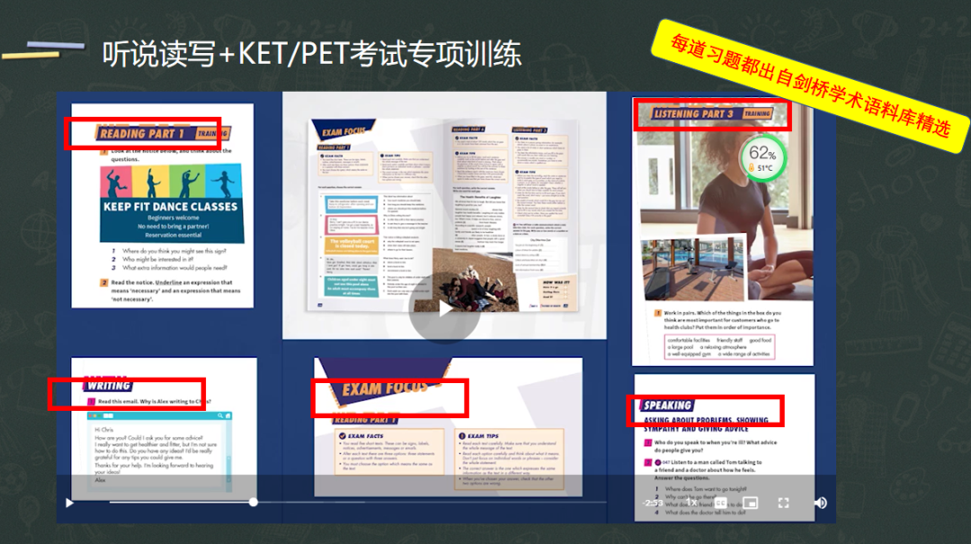 《open world》整本教材的听说读写部分均和剑桥考试相对应剑桥试卷上的每个PART都有反复演练。