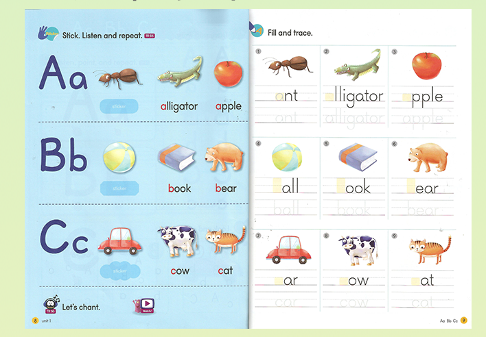 在学习字母时辅以单词强化巩固记忆,且学习单词时也不是简单的读记,而是在练习的同时通过读写,在潜移默化中完成输入的过程。