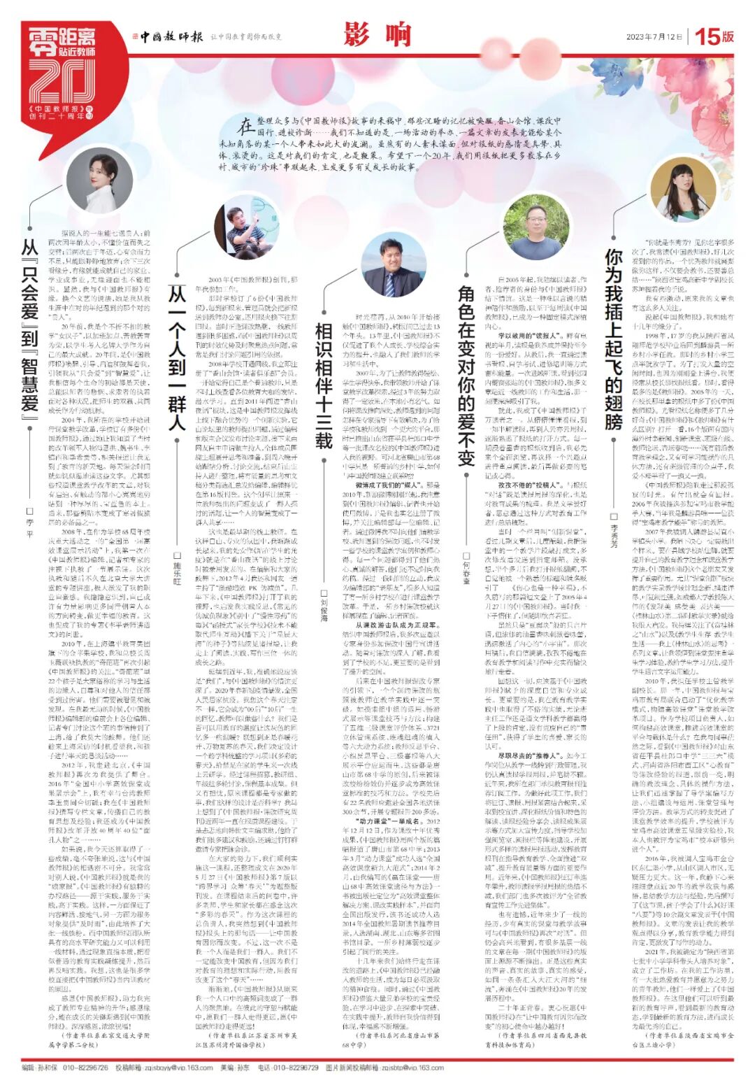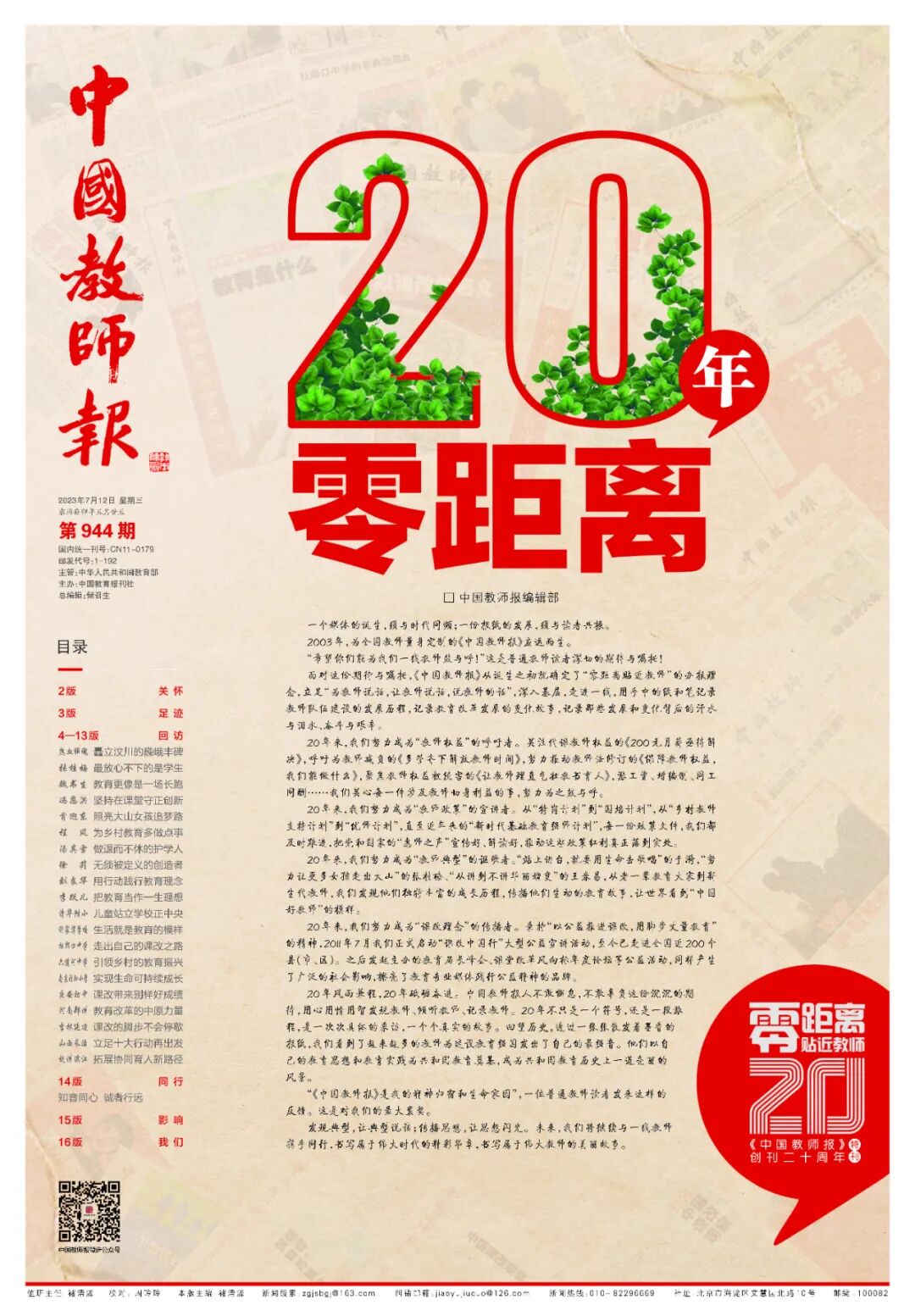 20年风雨兼程,20年砥砺奋进。中国教师报人不敢懈怠,不敢辜负这份沉沉的期待,用心用情用智发现教师、倾听教师、记录教师。20年不只是一个符号,还是一段旅程,是一次次具体的采访,一个个真实的故事。回望历史,透过一张张散发着墨香的报纸,我们看到了越来越多的教师为建设教育强国发出了自己的最强音。他们以自己的教育思想和教育实践为共和国教育奠基,成为共和国教育历史上一道亮丽的风景。