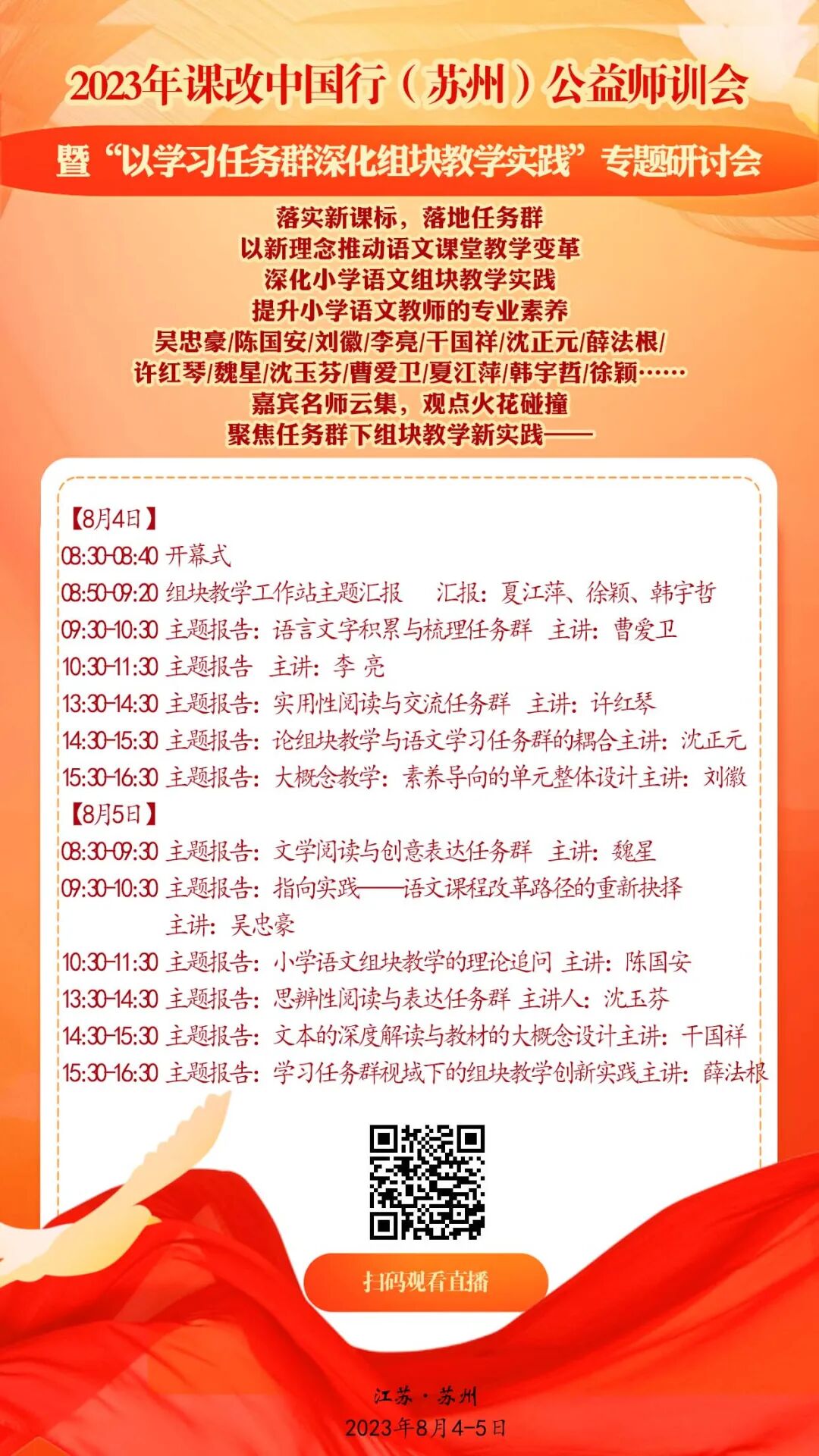 2023年课改中国行(苏州)公益师训会暨“以学习任务群深化组块教学实践”专题研讨会将于8月4日开幕,邀您线下参会!
