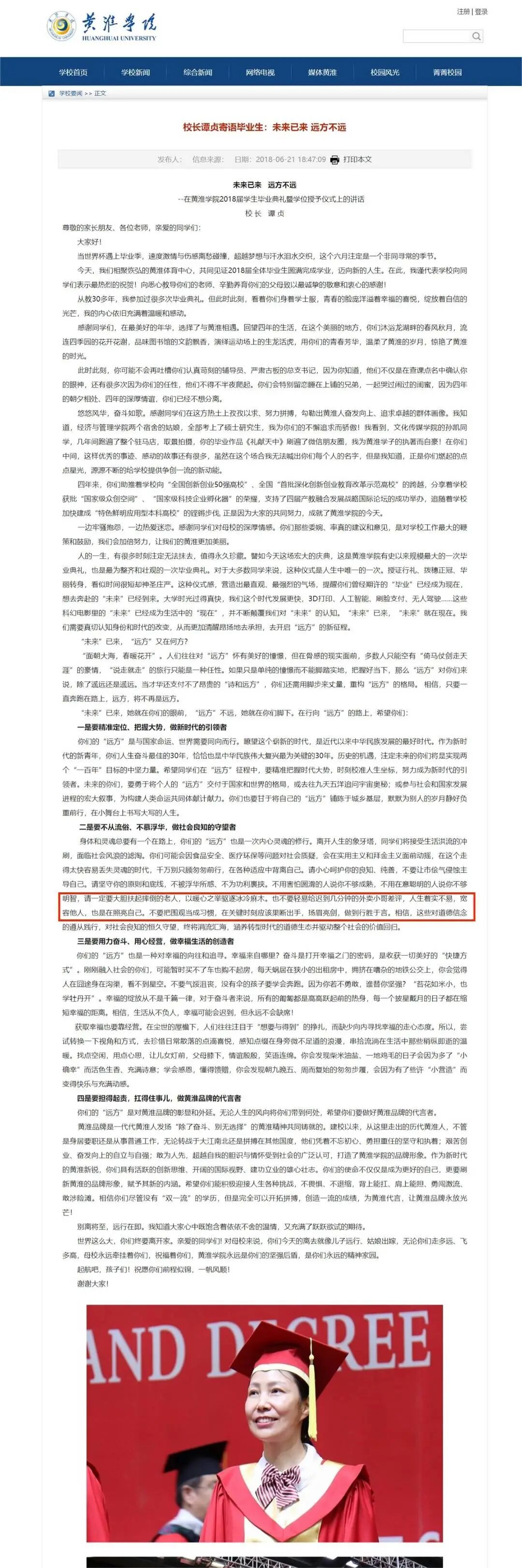 封面新闻记者查证了黄淮学院官网公布的校长毕业致辞。2018年,黄淮学院校长谭贞以《未来已来 远方不远》寄语毕业生,文中有一段这样写道: