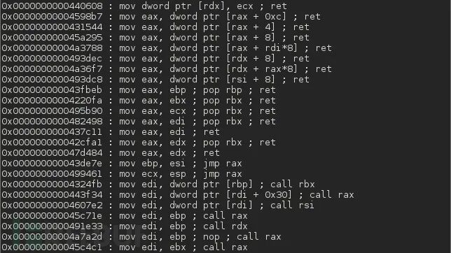 (向右滑动,查看更多)ROPgadget.py --binary ./test-suite-binaries/elf-Linux-x86ROPgadget.py --binary ./test-suite-binaries/elf-Linux-x86 --ropchainROPgadget.py --binary ./test-suite-binaries/elf-Linux-x86 --depth 3ROPgadget.py --binary ./test-suite-binaries/elf-Linux-x86 --string "main"ROPgadget.py --binary ./test-suite-binaries/elf-Linux-x86 --string "m..n"ROPgadget.py --binary ./test-suite-binaries/elf-Linux-x86 --opcode c9c3ROPgadget.py --binary ./test-suite-binaries/elf-Linux-x86 --only "mov|ret"ROPgadget.py --binary ./test-suite-binaries/elf-Linux-x86 --only "mov|pop|xor|ret"ROPgadget.py --binary ./test-suite-binaries/elf-Linux-x86 --filter "xchg|add|sub|cmov.*"ROPgadget.py --binary ./test-suite-binaries/elf-Linux-x86 --norop --nosysROPgadget.py --binary ./test-suite-binaries/elf-Linux-x86 --range 0x08041000-0x08042000ROPgadget.py --binary ./test-suite-binaries/elf-Linux-x86 --string main --range 0x080c9aaa-0x080c9abaROPgadget.py --binary ./test-suite-binaries/elf-Linux-x86 --memstr "/bin/sh"ROPgadget.py --binary ./test-suite-binaries/elf-Linux-x86 --consoleROPgadget.py --binary ./test-suite-binaries/elf-Linux-x86 --badbytes "00|01-1f|7f|42"ROPgadget.py --binary ./test-suite-binaries/Linux_lib64.so --offset 0xdeadbeef00000000ROPgadget.py --binary ./test-suite-binaries/elf-ARMv7-ls --depth 5ROPgadget.py --binary ./test-suite-binaries/elf-ARM64-bash --depth 5ROPgadget.py --binary ./test-suite-binaries/raw-x86.raw --rawArch=x86 --rawMode=32ROPgadget.py --binary ./test-suite-binaries/elf-Linux-RISCV_64 --depth 8