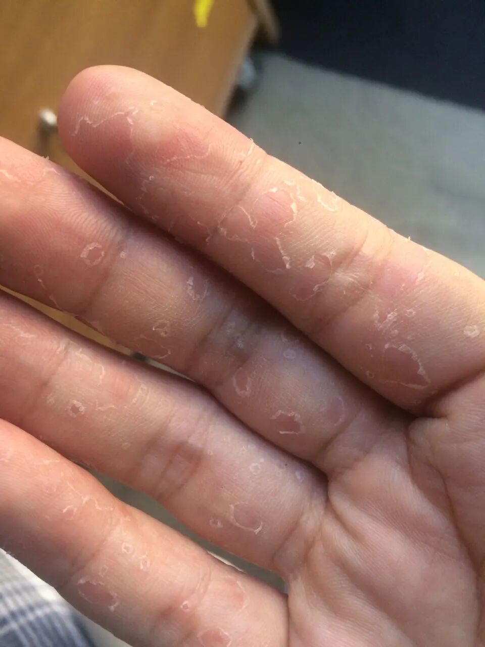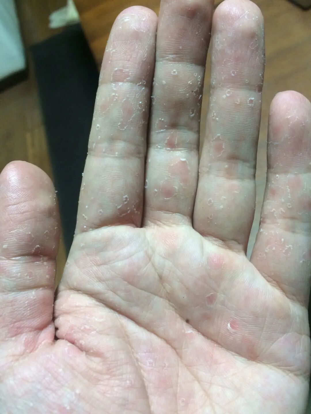 之后满手的小疱疹开始一个个爆皮,一段时间内简直惨不忍睹,想了想放了当时拍的两只手的相片在下面(先发三条警示,同理本文标题图也换成了“概念款”):
