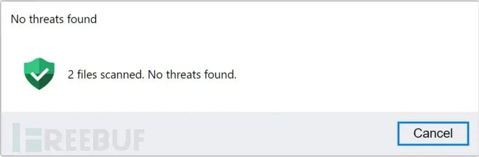 这个伪造的窗口效果十分逼真,甚至还包含虚假的安全扫描按钮,点击该按钮后会提示文件已被扫描且未检测到威胁。