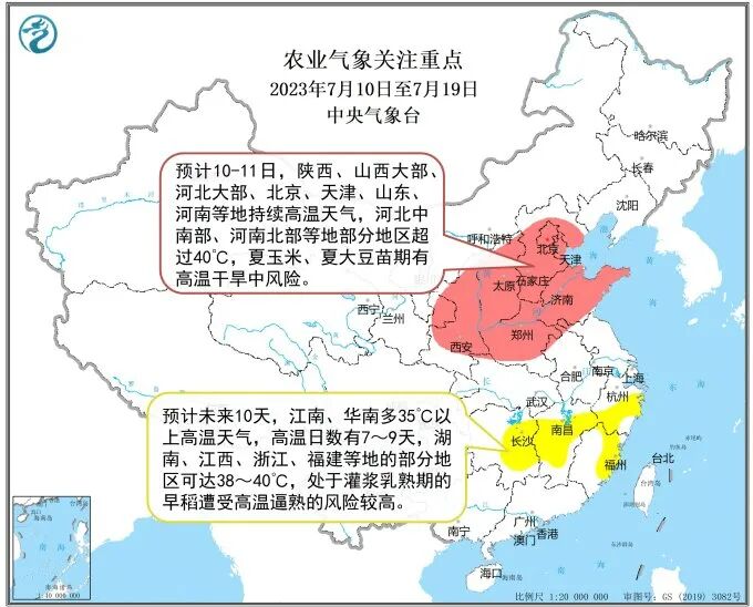 中央气象台预计,7月中旬,江南、华南等地多35℃以上高温天气,高温日数一般有7~9天,其中,湖南、江西、浙江、福建等地的部分地区可达38~40℃。(图/中国气象局)