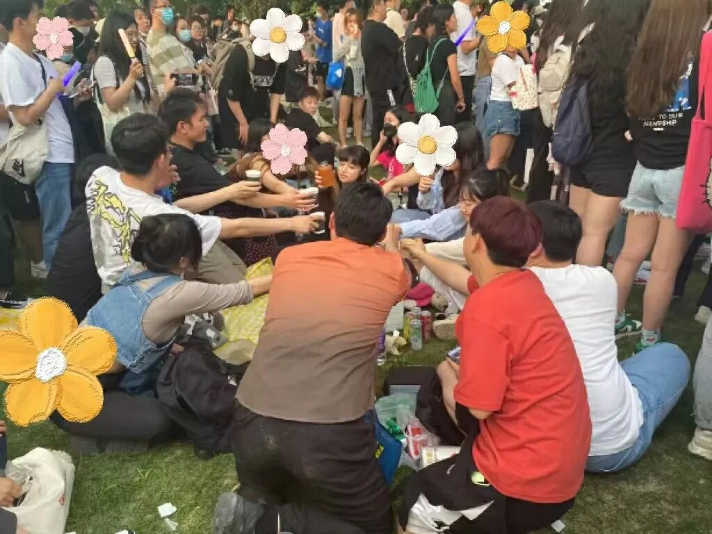 下午四点半,人流向着鸟巢逐渐聚拢。他们带着荧光棒和折叠椅,从K/L口附近的草坪,逐渐扩散到与水立方之间的空地上。18岁的吴文远匆匆从学校赶到现场,此时他已抢不到前五排的“站票席”。两个小时的时间里,人群已经自鸟巢的围栏向外挤了三四十米,不少人甚至铺开野餐布、摆上零食酒水,席地而坐,地势稍高一点的绝佳“观看点”则全无无落脚之地。