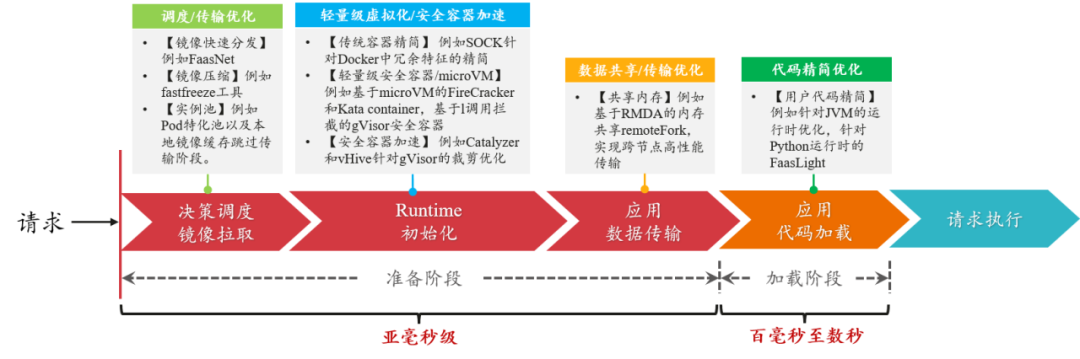 当冷启动发生时,Serverless 平台内部实例的初始化过程可以划分为准备和加载两个阶段。其中,准备阶段主要包括控制面决策调度 / 镜像获取、Runtime 运行时初始化、应用数据 / 代码传输几个部分。而加载阶段位于实例内部,包括用户应用框架和代码的初始化过程。在工业界和学术界公开的研究成果中,针对实例启动过程中的每个阶段都有大量的技术手段和优化方法。如下图所示,经过优化,实例冷启动的准备阶段和加载阶段时间可被极大地缩短。