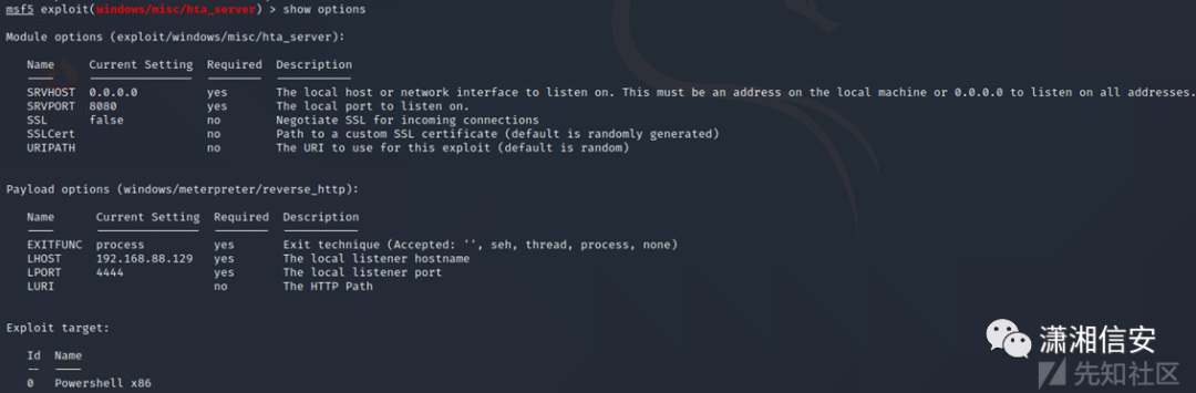 步骤一:使用exploit/windows/misc/hta_server生成病毒