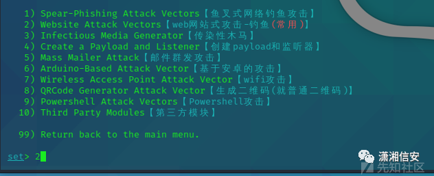 1) Spear-Phishing Attack Vectors【鱼叉式网络钓鱼攻击】2) Website Attack Vectors【web网站式攻击-钓鱼(常用)】3) Infectious Media Generator【传染性木马】4) Create a Payload and Listener【创建payload和监听器】5) Mass Mailer Attack【邮件群发攻击】6) Arduino-Based Attack Vector【基于安卓的攻击】7) Wireless Access Point Attack Vector【wifi攻击】8) QRCode Generator Attack Vector【生成二维码(就普通二维码)】9) Powershell Attack Vectors【Powershell攻击】10) Third Party Modules【第三方模块】