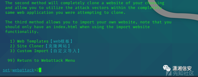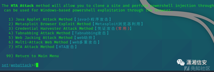 1) Java Applet Attack Method【java小程序攻击】2) Metasploit Browser Exploit Method【Metasploit浏览器利用】3) Credential Harvester Attack Method【凭证攻击(常用)】4) Tabnabbing Attack Method【Tabnabbing攻击】5) Web Jacking Attack Method【web劫持】6) Multi-Attack Web Method【web多重攻击】7) HTA Attack Method【HTA攻击】