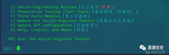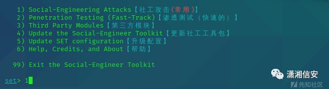1) Social-Engineering Attacks【社工攻击(常用)】2) Penetration Testing (Fast-Track)【渗透测试(快速的)】3) Third Party Modules【第三方模块】4) Update the Social-Engineer Toolkit【更新社工工具包】5) Update SET configuration【升级配置】6) Help, Credits, and About【帮助】