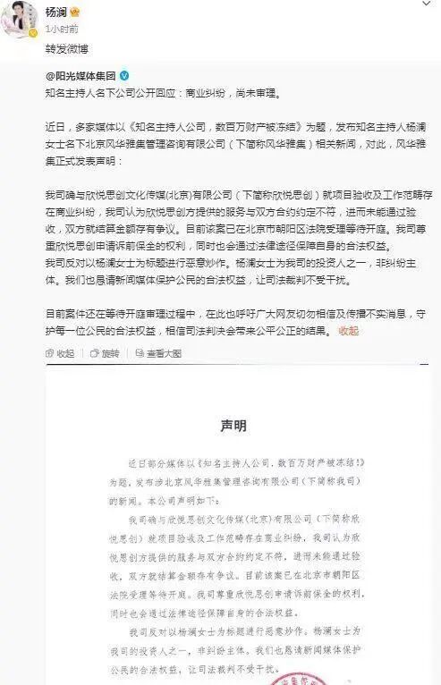 杨澜控股的阳光媒体集团官方出面回应这个情况,他们表示:这是一场商业纠纷,尚未审理,杨澜并非纠纷的主要参与方。声明发布后,杨澜迅速转发了这条微博,但并未再做出其他的回应。