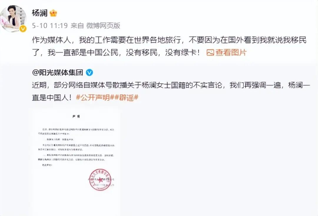 在阳光媒体集团澄清杨澜国籍的声明发布后,杨澜特意转发了这条声明,并表示,“作为一个媒体人,我需要在全球各地出差,不要因为在国外看到我就说我移民了。我一直都是中国公民,没有移民,没有绿卡。”
