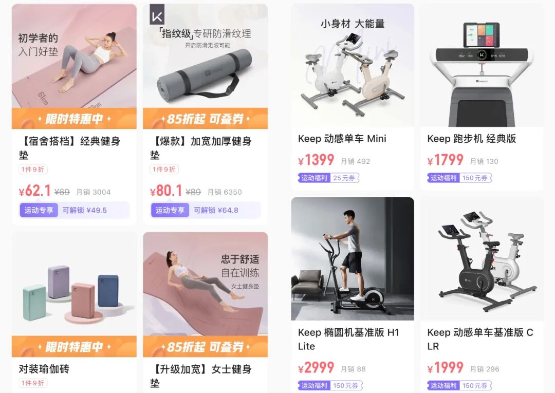 像什么智能单车、智能手环、跑步机、瑜伽垫都有的卖,甚至 Keep 还长期霸榜国内最大的瑜伽垫品牌,去年差不多占了 20% 的市场。