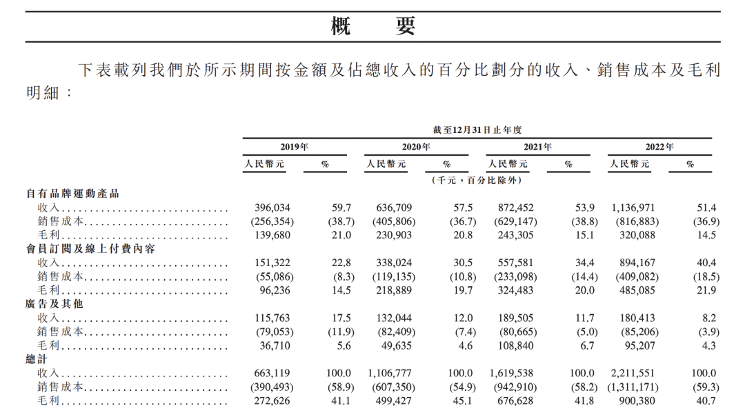 世超翻了翻 Keep 最新的招股书,发现 Keep 的营收主要是自有品牌运动产品、会员订阅及线上付费内容和广告及其他收入三大部分。