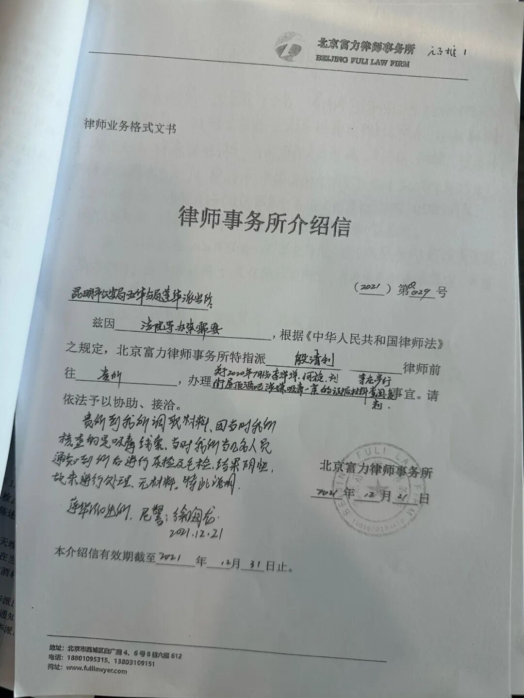 2021年12月31日,刘向阳的代理律师殷清利到昆明市公安局五华分局莲华派出所,办理2020年7月份李洋洋、何旋、刘向阳等在步行街屋顶酒吧涉嫌吸毒一案的证据材料查阅、复制,莲华派出所民警徐海龙在律师事务所介绍信上写下证明:贵所到我所调取材料,因当时我所核查的是吸毒线索,当时我所当(把)几名人员通知到所后进行尿检及毛发检,结果阴性,故未进行处理,无材料。