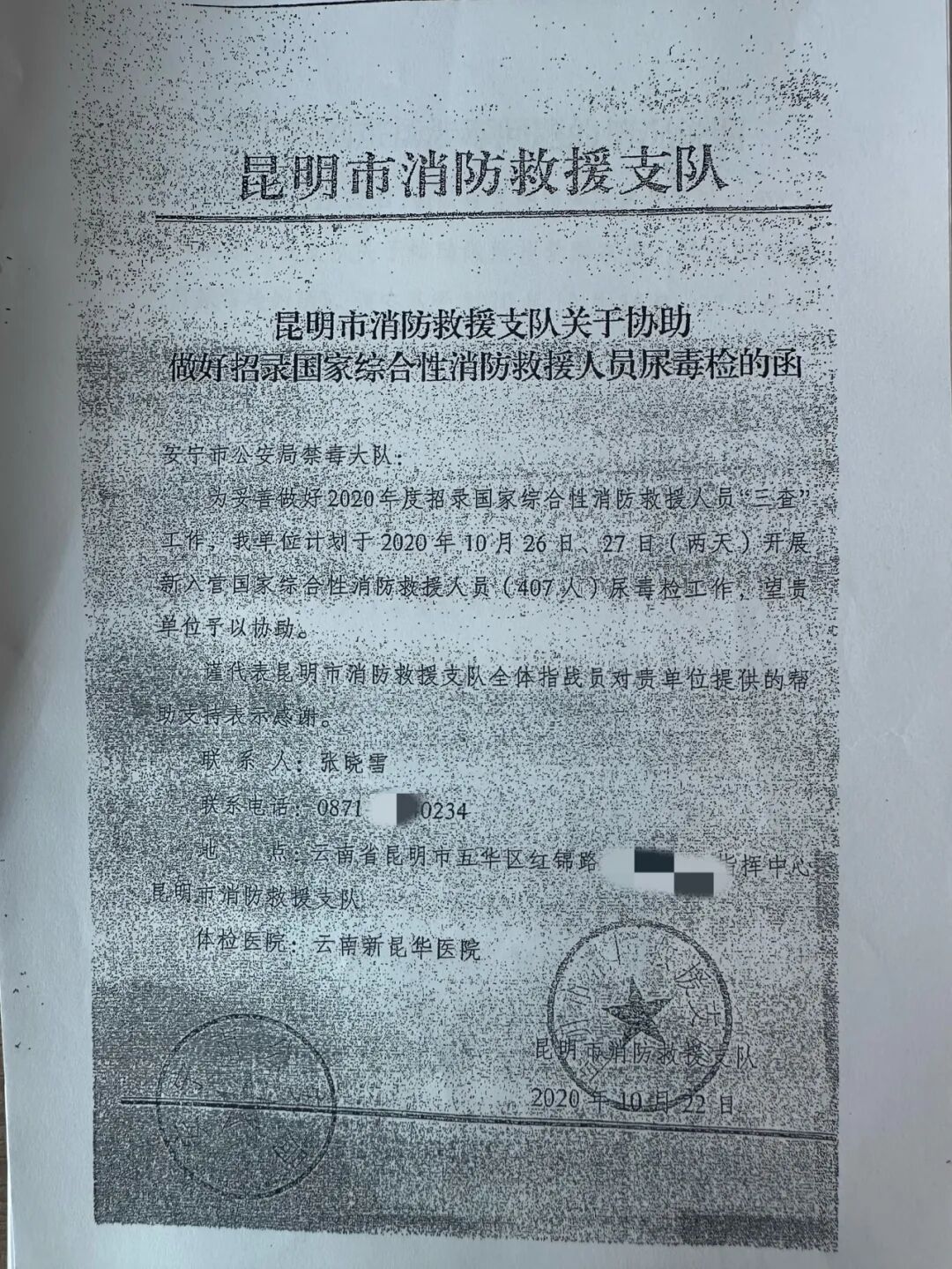 2020年10月22日,昆明市消防救援支队致安宁市公安局禁毒大队下发的《关于协助做好招录国家综合性消防救援人员尿毒检的函》称,为做好年度招录国家综合性消防救援人员“三查”工作,昆明市消防支队计划于10月26日与27日两天,对新入营的407名消防救援人员开展尿毒检工作。同时还特别提到,希望安宁市公安局禁毒大队予以协助。