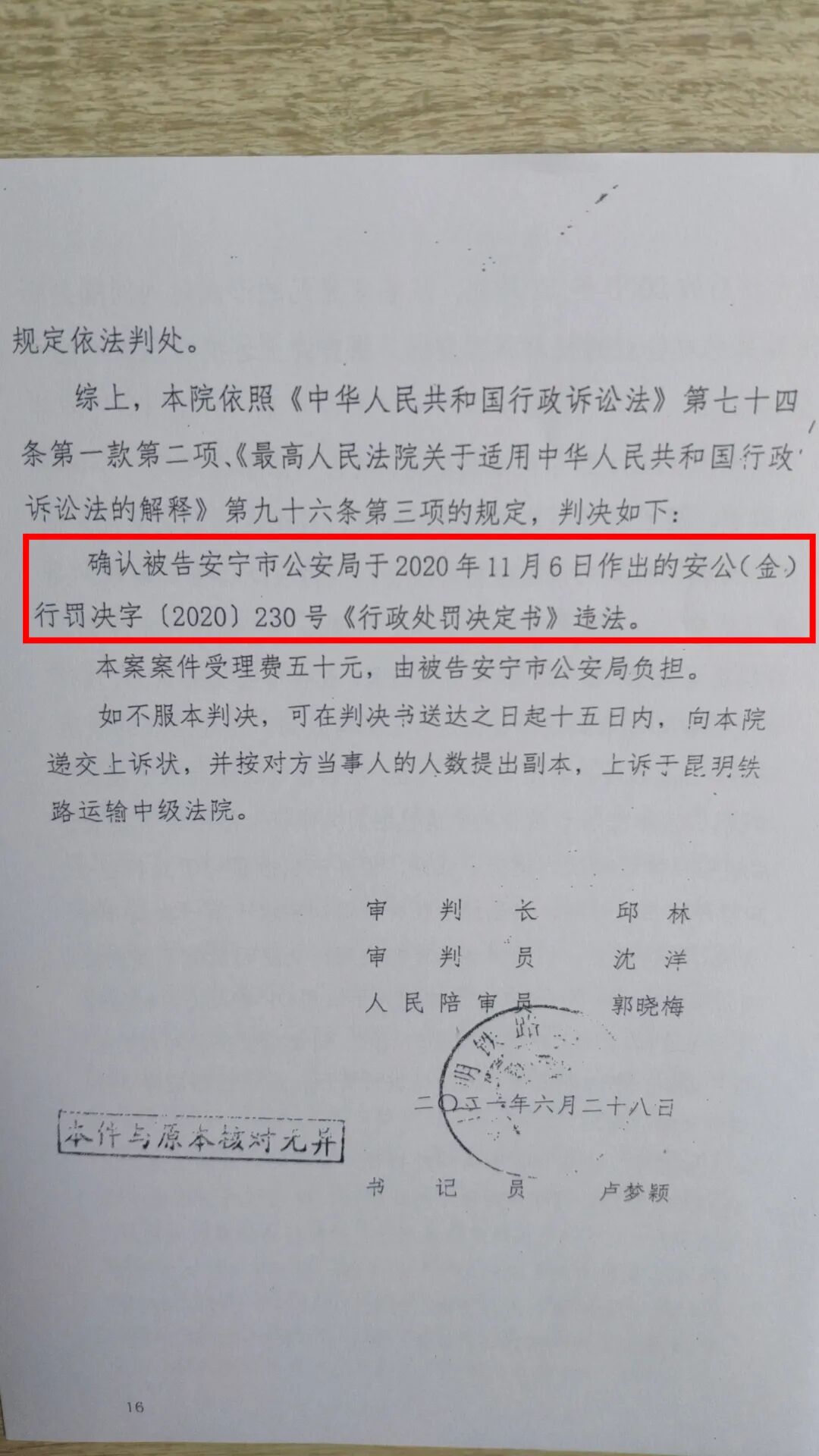 2021年6月28日,昆明铁路运输法院作出一审判决如下:确认被告安宁市公安局作出对刘向阳的《行政处罚决定书》违法。