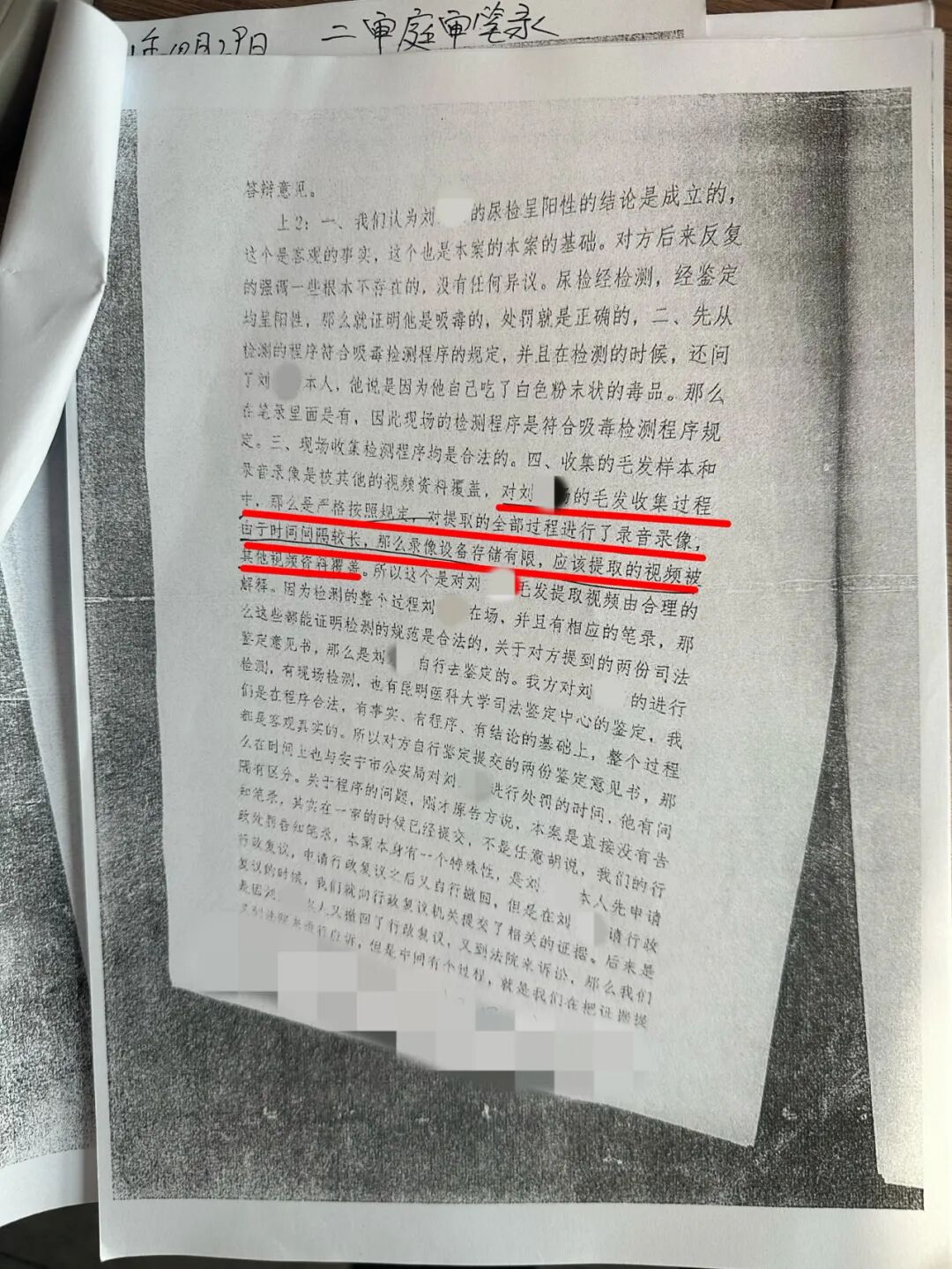 而且,缺乏收集刘向阳毛发的录音录像。安宁市公安局在庭审中对此的解释是,检测毛发它是一个简单的程序,是一个临时性的处罚,后续有很多是已经被覆盖掉,所以录音录像是有过,是时间间隔长了,就被其他的视频资料给覆盖掉了。现场检测的视频反映的检测过程是完整的,可能存在一点瑕疵,即刘向阳方提到的铝箔纸包裹问题,但这不影响检测结果的准确性,整个检测过程是公开透明也是合法的。