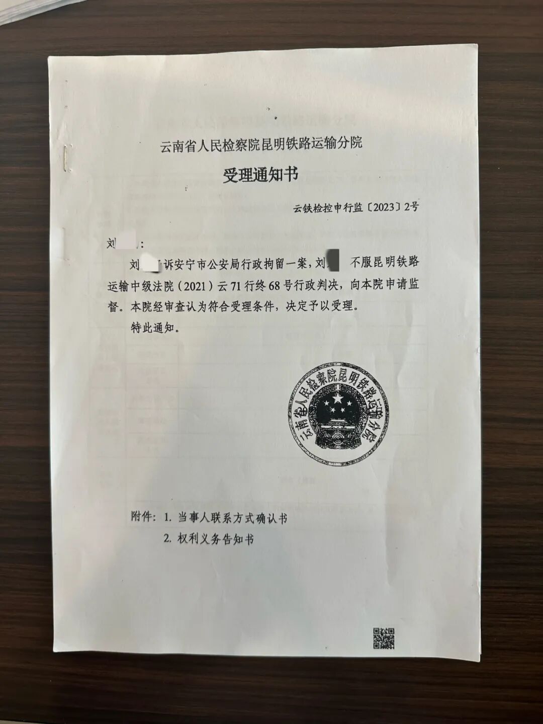 一个好的消息是,刘向阳诉安宁市公安局行政拘留检察监督一案,已获云南省人民检察院昆明铁路运输分院受理。目前,此案仍在调查核实中。