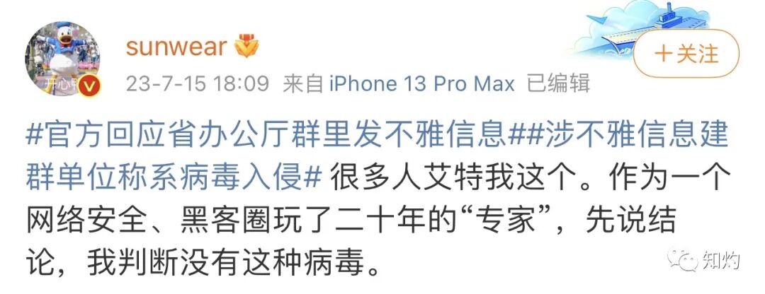 7月15日晚6时许,微博平台身份认证为“信息安全、网络安全、信息站”的大V@sunwear公开表示,他作为一名在网络安全、黑客圈20年左右的“专家”,认为没有这种病毒。