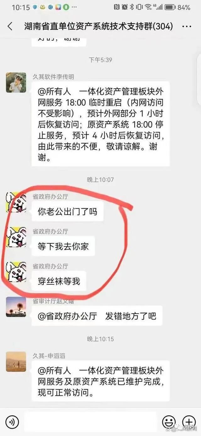 根据网传信息显示,7月14日晚10时07分,一名为“湖南省直单位资产系统技术支持”微信群中,一个名为“省政府办公厅”的用户连续发送了“你老公出门了吗”“等下我去你家”“穿丝袜等我”。