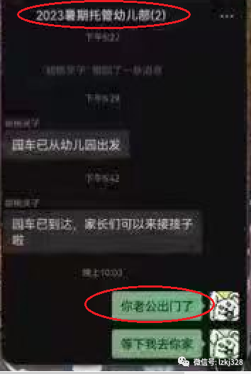 一张名为“2023暑期托管幼儿园(2)”微信群,信息为“你老公出门了”“等下我去你家”;