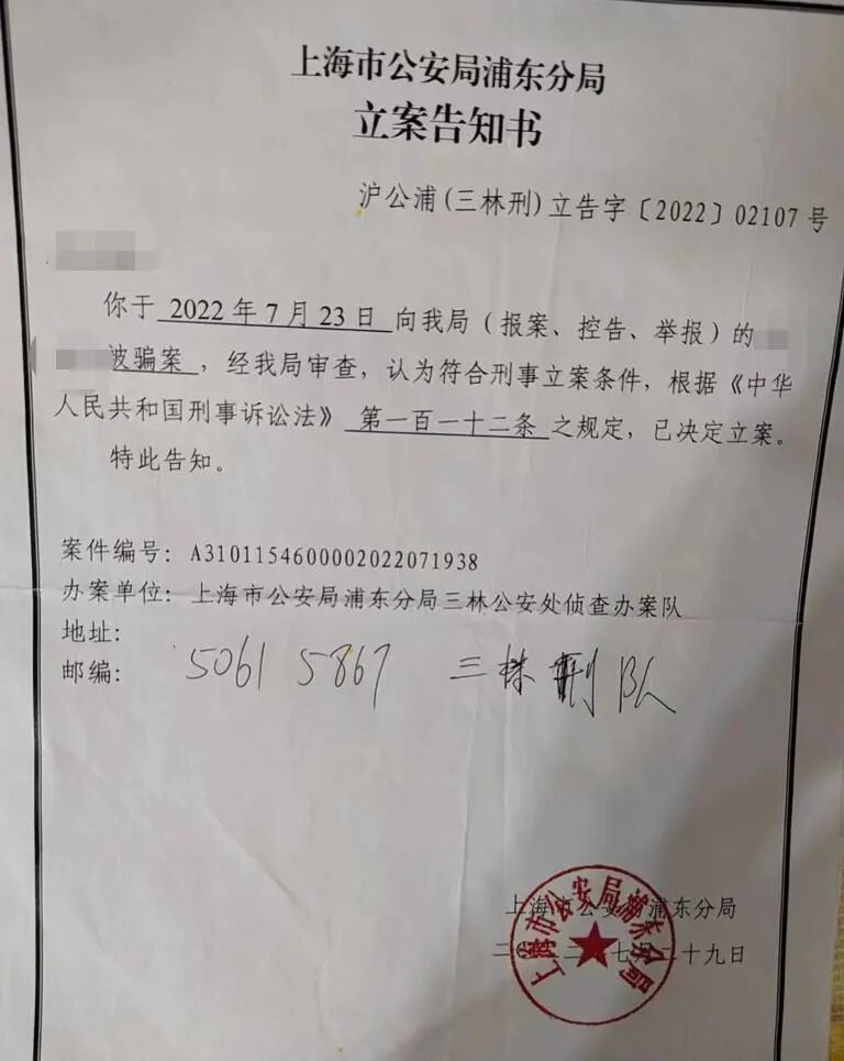 她去报警,10月10日,上海市公安局浦东分局决定立案。